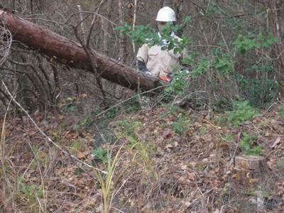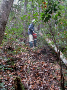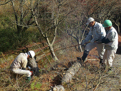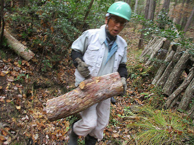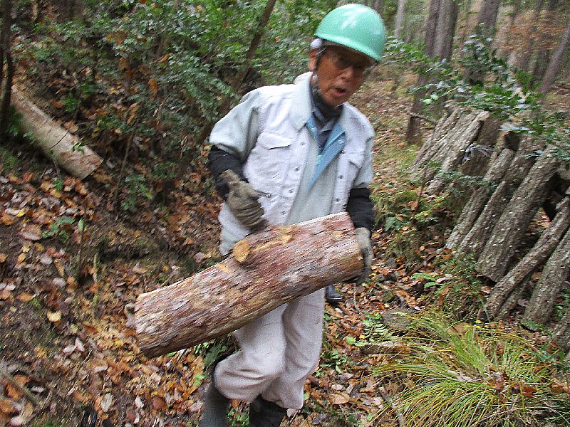 倒したコナラを太い部分は薪用に細い部分は炭焼き用に定寸切り作業
