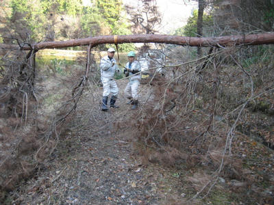 元気松林近くの散策路に倒れる恐れのある枯れ松の伐倒玉切り作業