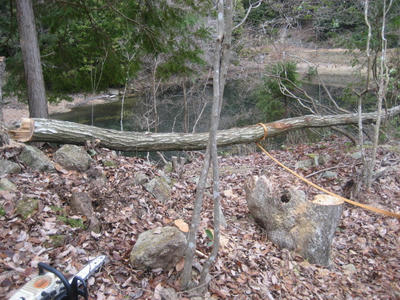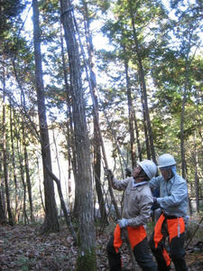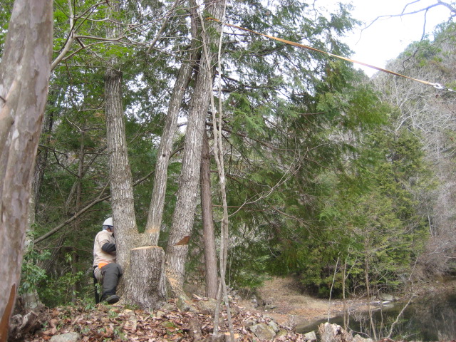 コナラの大木を目標方向に倒すためロープを掛けチルホールで