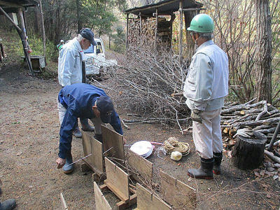 定寸切りしたコナラを軽トラに積み込み炭窯前へ搬送作業