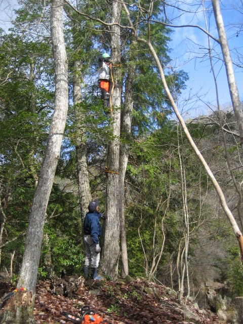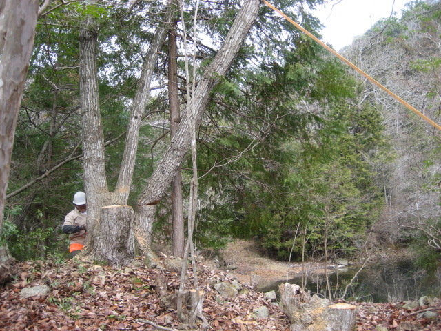 導入路の枯れ松伐倒作業 目標方向に倒すためロープを掛け