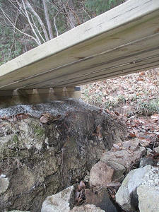 木橋の補修:大量の水で木橋の土台の下ががえぐられていたので
