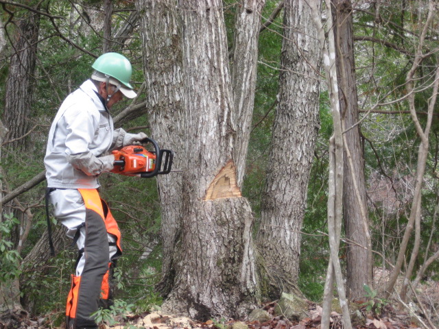 コナラの大木に倒す方向にチエンソーで受け口の切込みをいれ