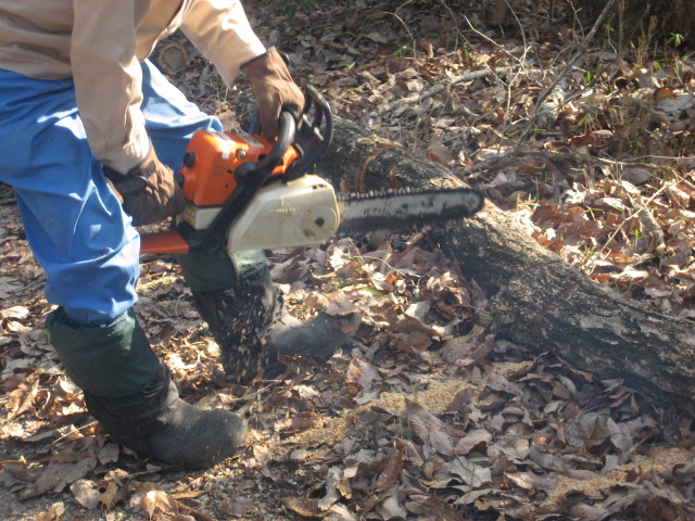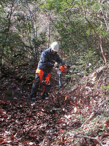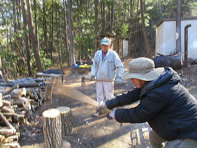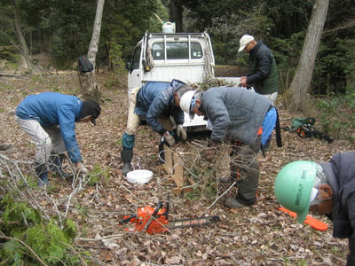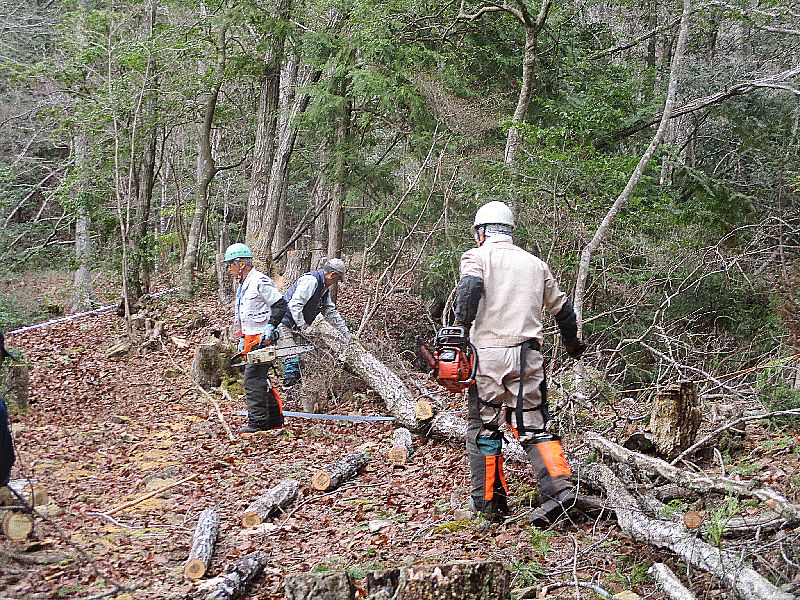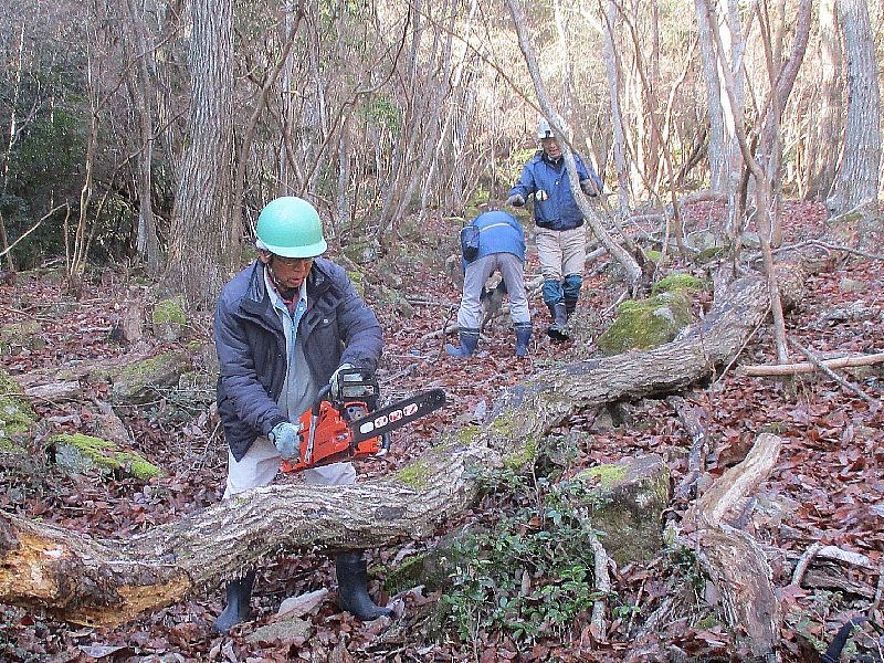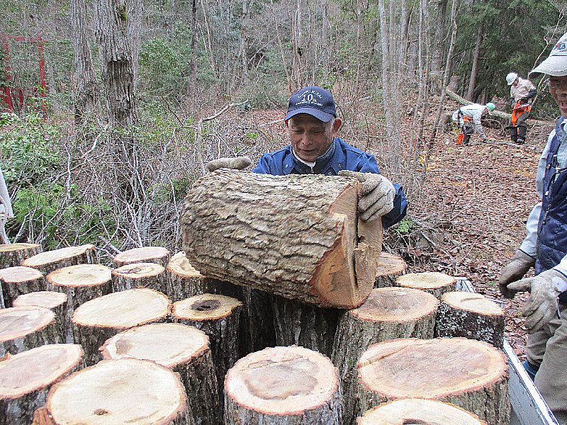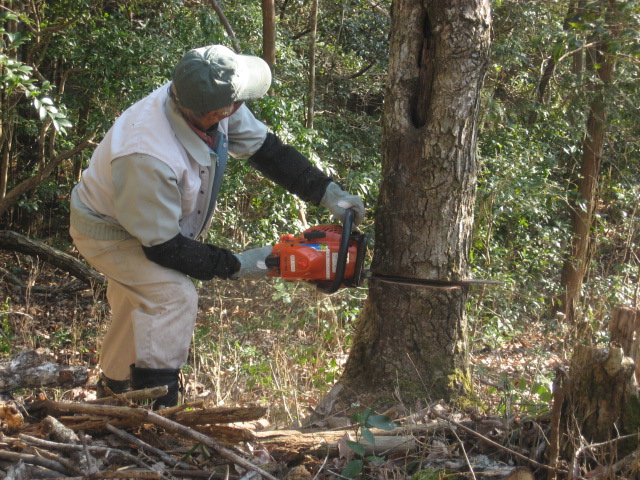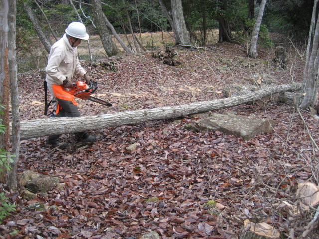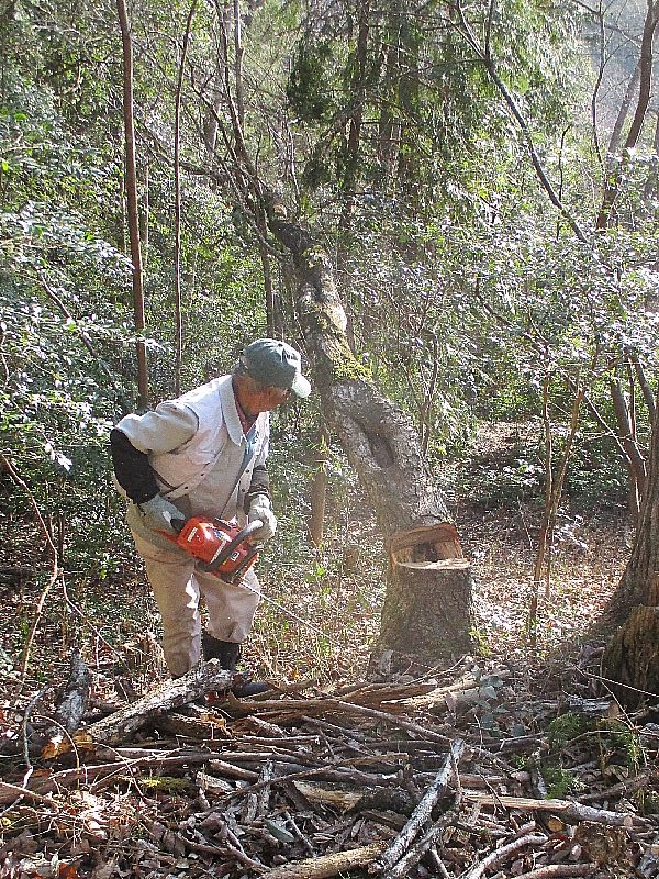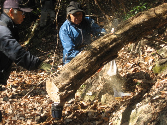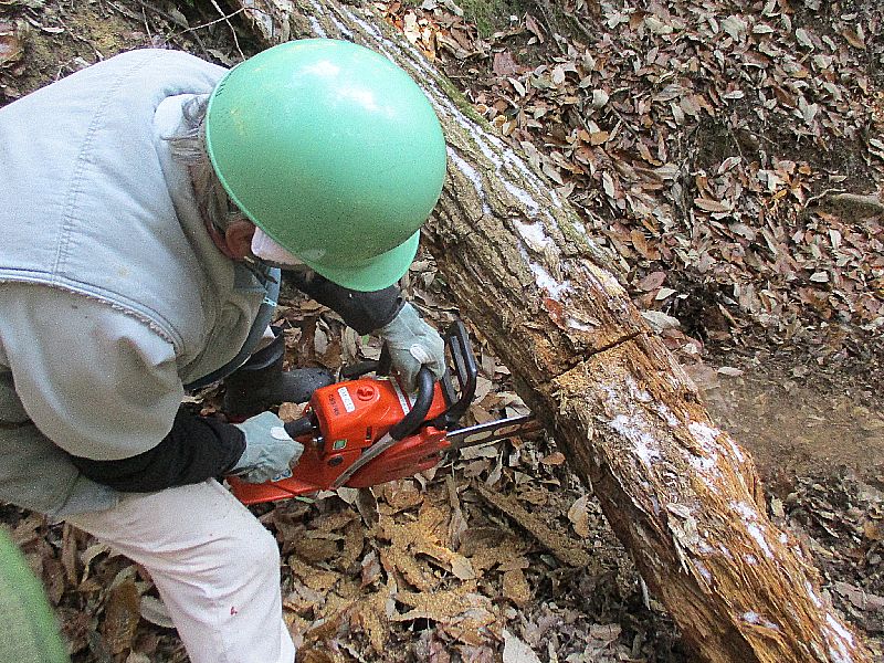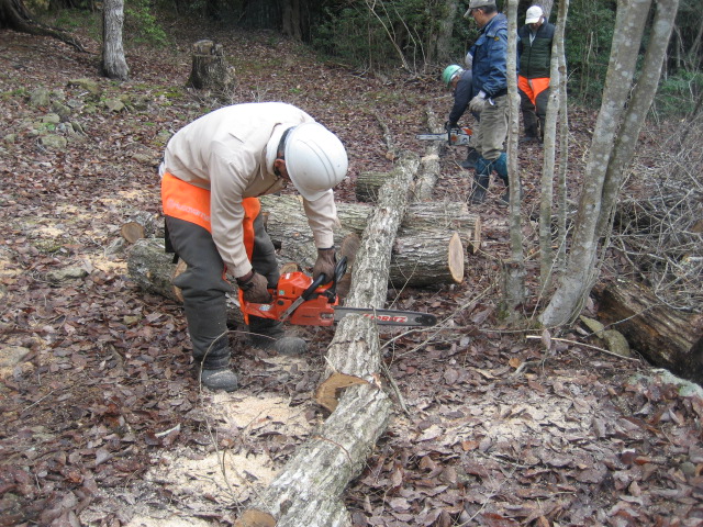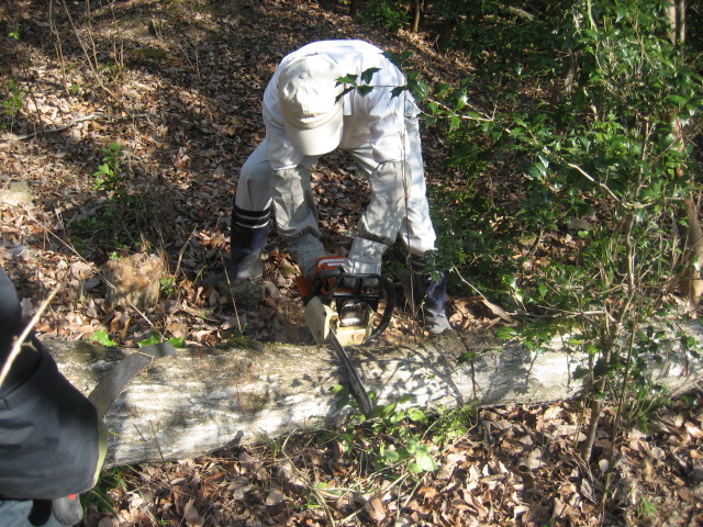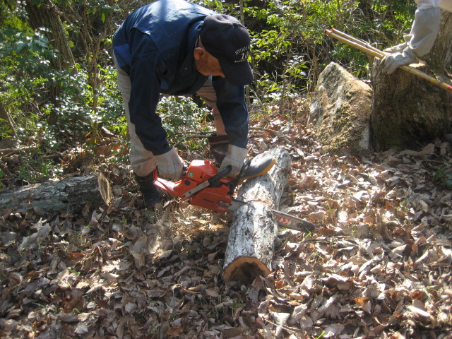倒したコナラを太い部分は薪用に細い部分は炭焼き用に定寸切り作業