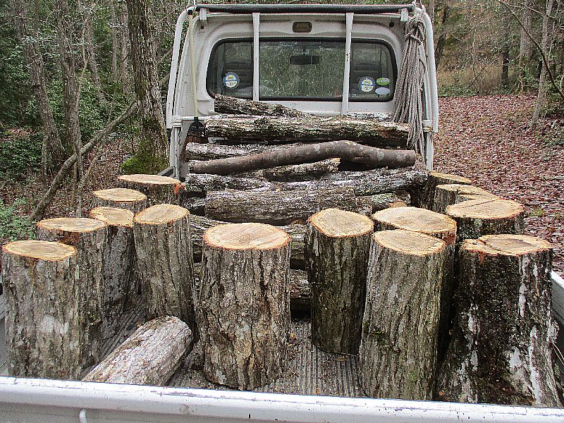 定寸切りしたコナラ材を軽トラに積み込み炭窯前に搬送
