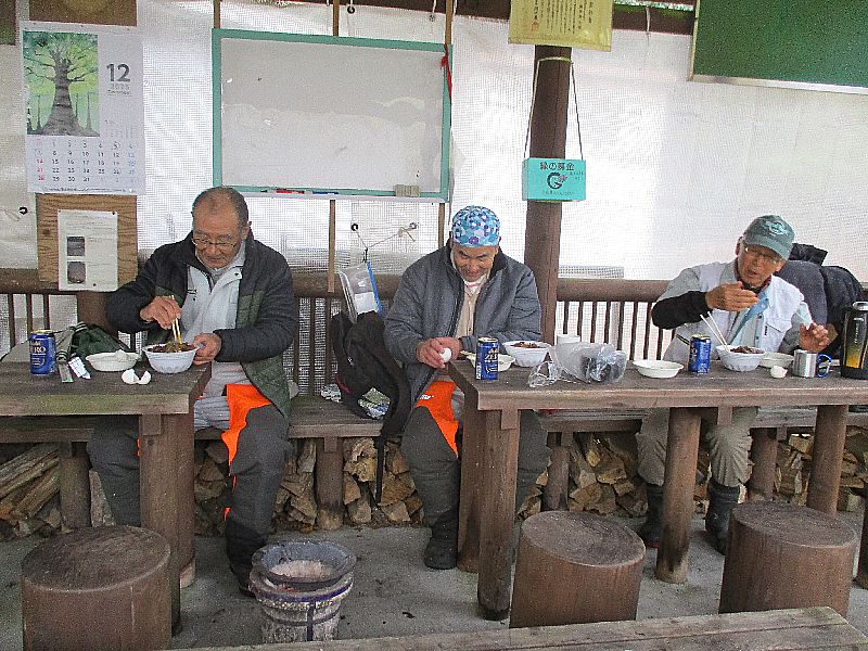 2025.12.26(金)薪及び炭焼き用にコナラの伐倒・定寸切り・搬送:お昼はグルメ担当さんが準備してくれたすき焼きを美味しく頂きました