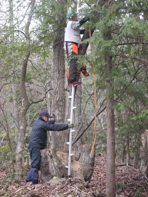 目標方向に安全且つ正確に倒すためハシゴでコナラの出来る限り上にロープを掛けチルホールで引っ張る準備