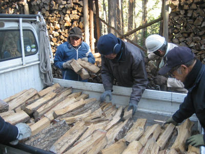 共生センターへ薪を搬送するため軽トラに積み込み作業