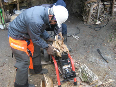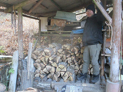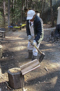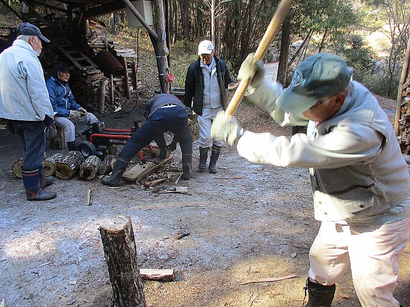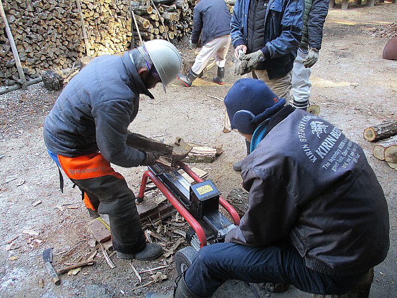 2026.01.23(金)(薪及び炭材)用にコナラの薪割り(薪割り機・手斧):共生センターに薪の搬送