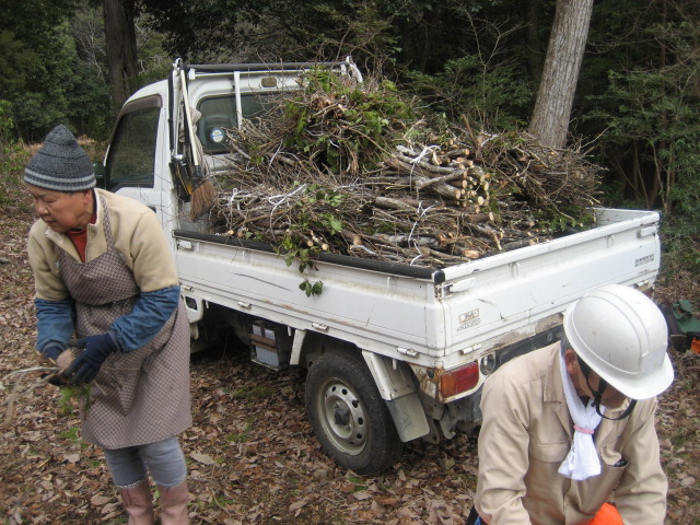 定寸切りしたコナラを軽トラに積み込み炭窯前へ搬送作業