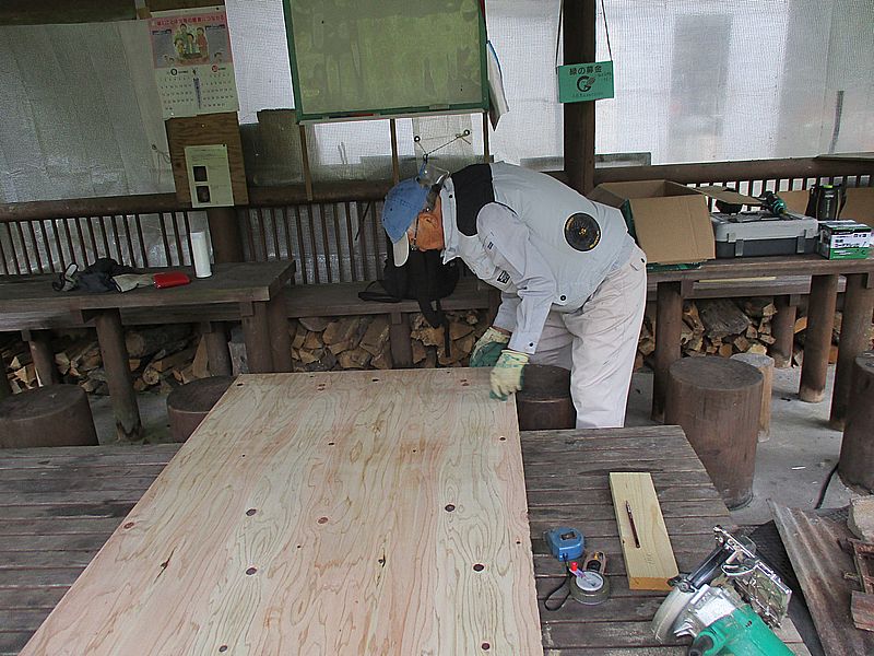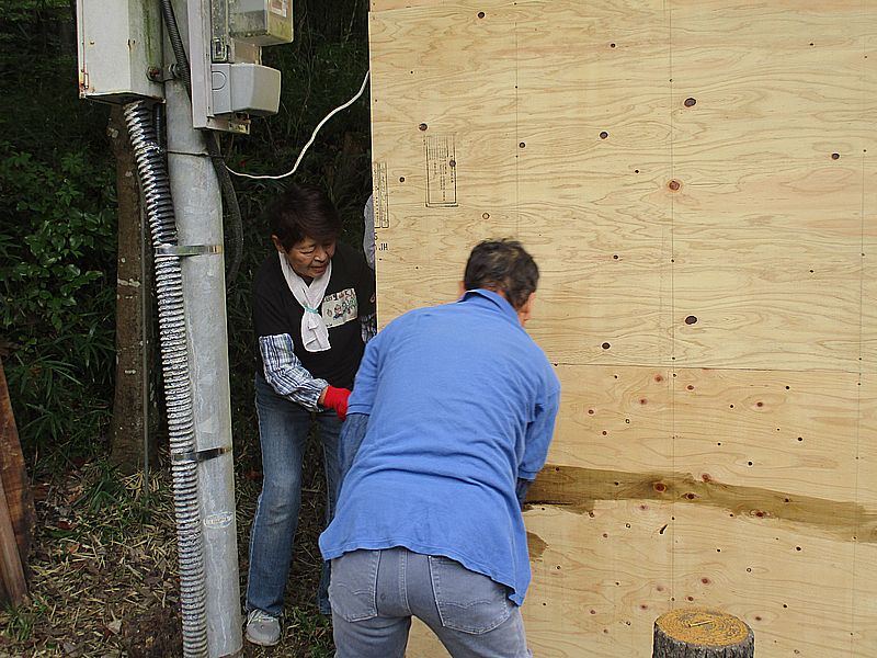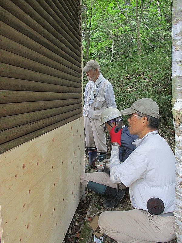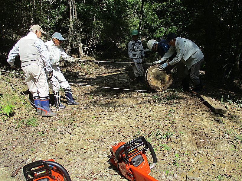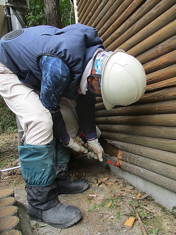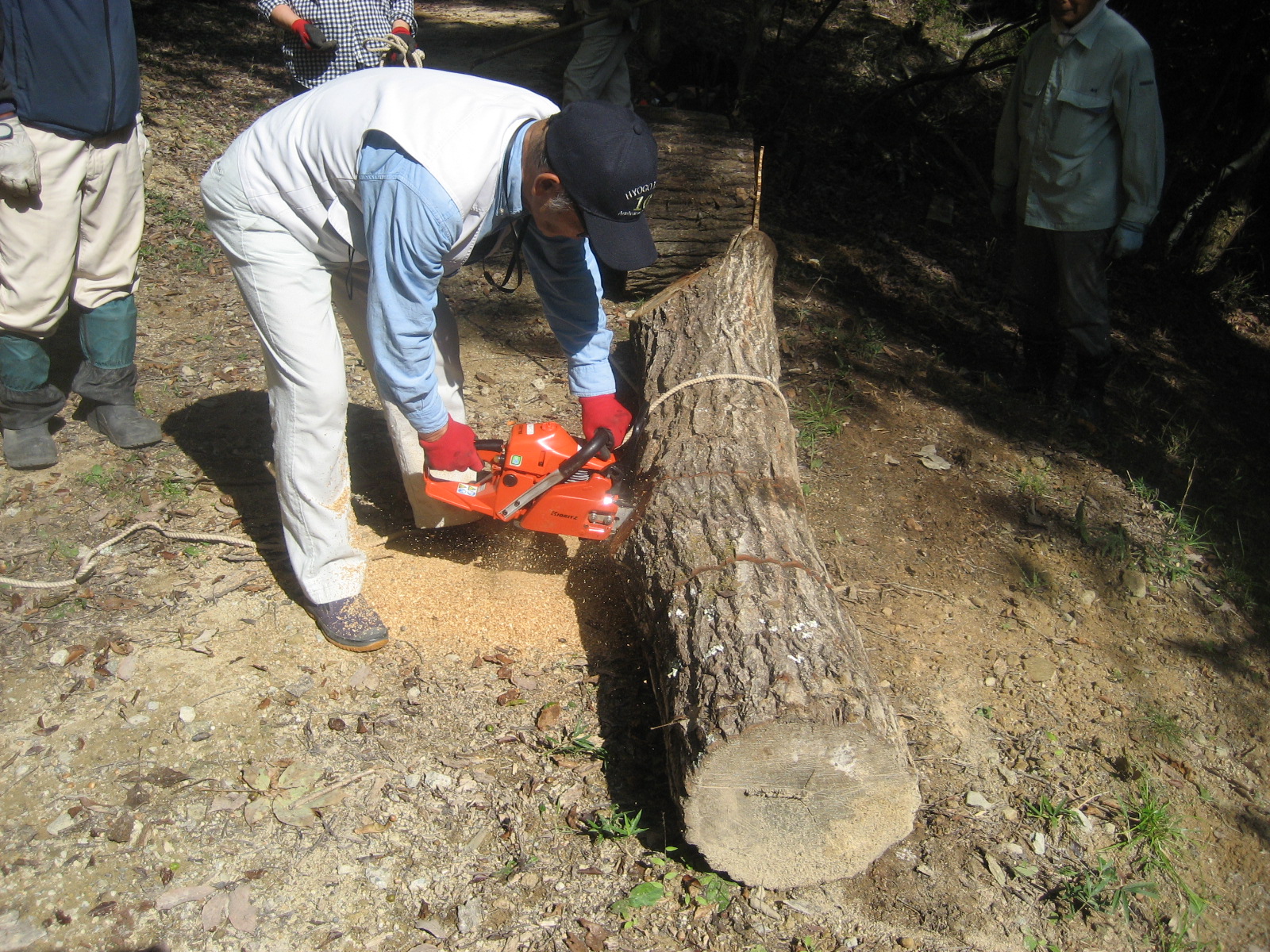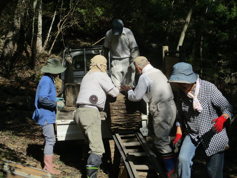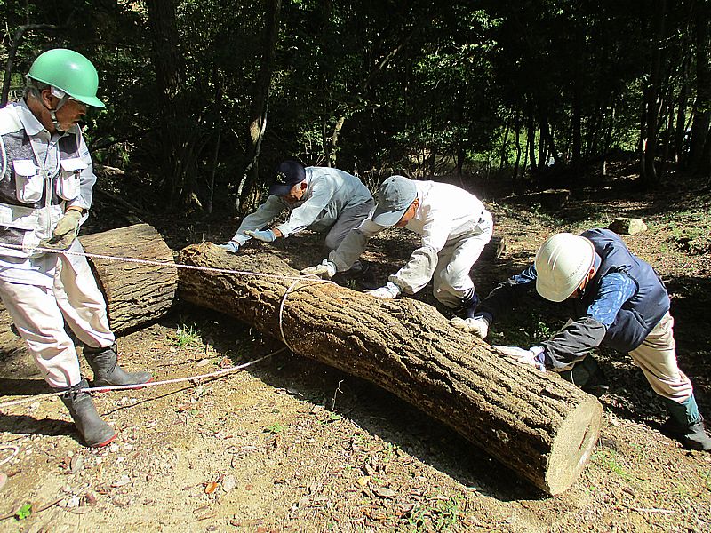 2024.10.06(日)バイオトイレ点検口カバー取り付け作業・椎茸ホダギの本伏・コナラ大木の玉切及び炭窯前への搬送