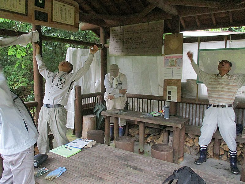 雨のため外でラジオ体操出来ず狭い東屋で・・・
