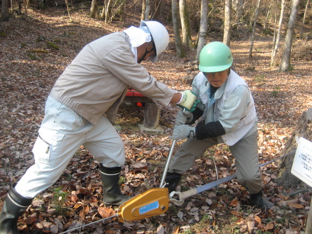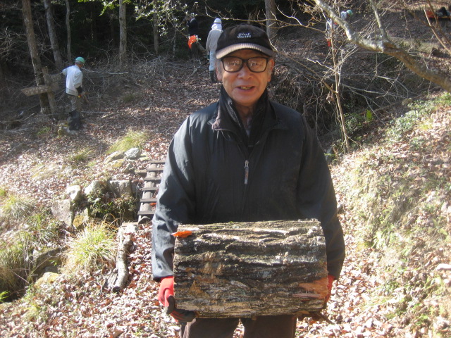 2026.01.17(土)前回、木橋の付け根が土砂でえぐられ大きな石を敷き詰めた後にセメントを流し込み固定作業及び炭材用にコナラの伐倒搬送作業