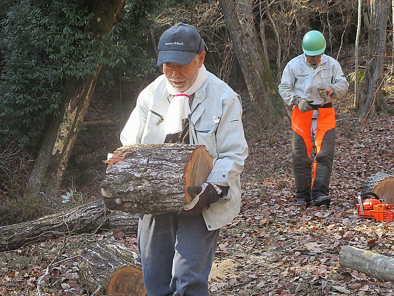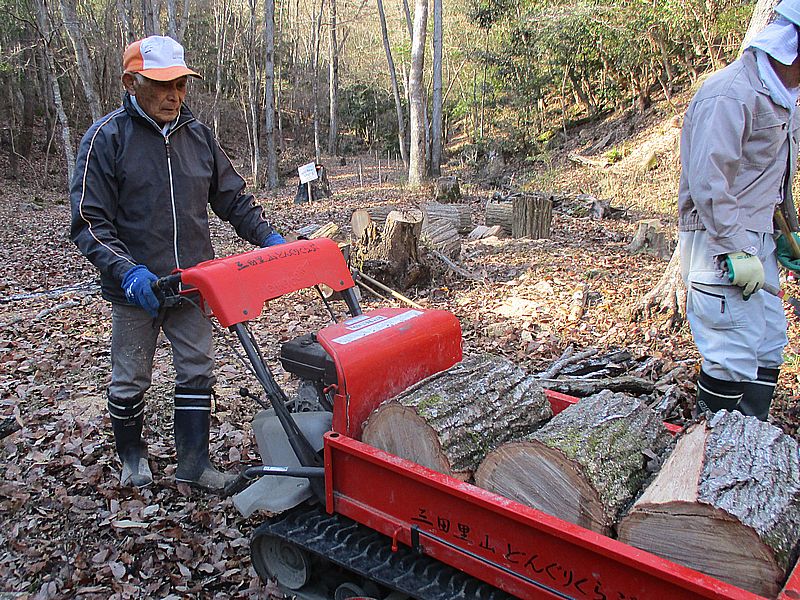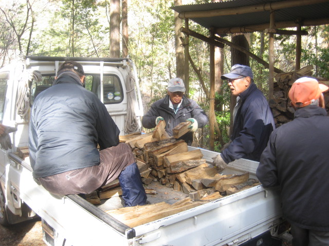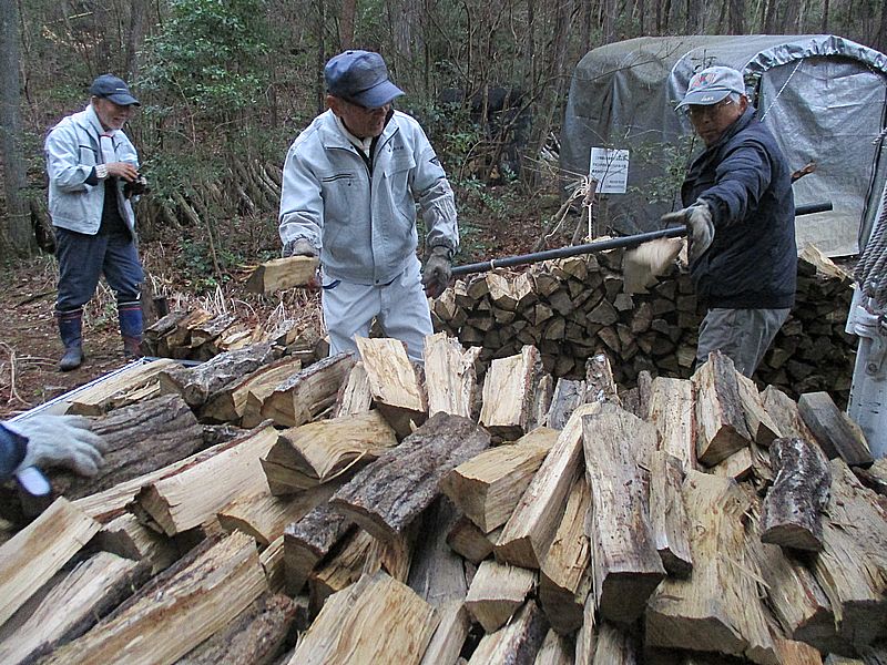 2026.01.23(金)(薪及び炭材)用にコナラの薪割り(薪割り機・手斧):共生センターに薪の搬送