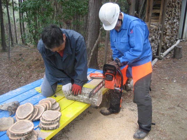 高平小3年生クラフト用台座用:コナラをチエンソーで1~2cm