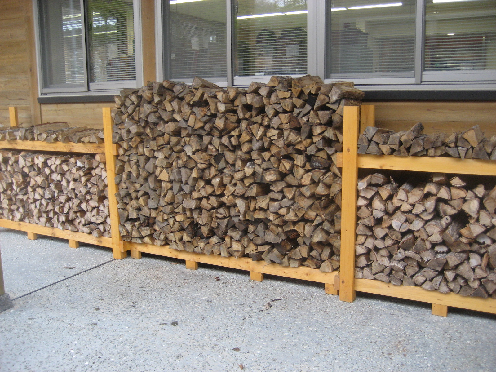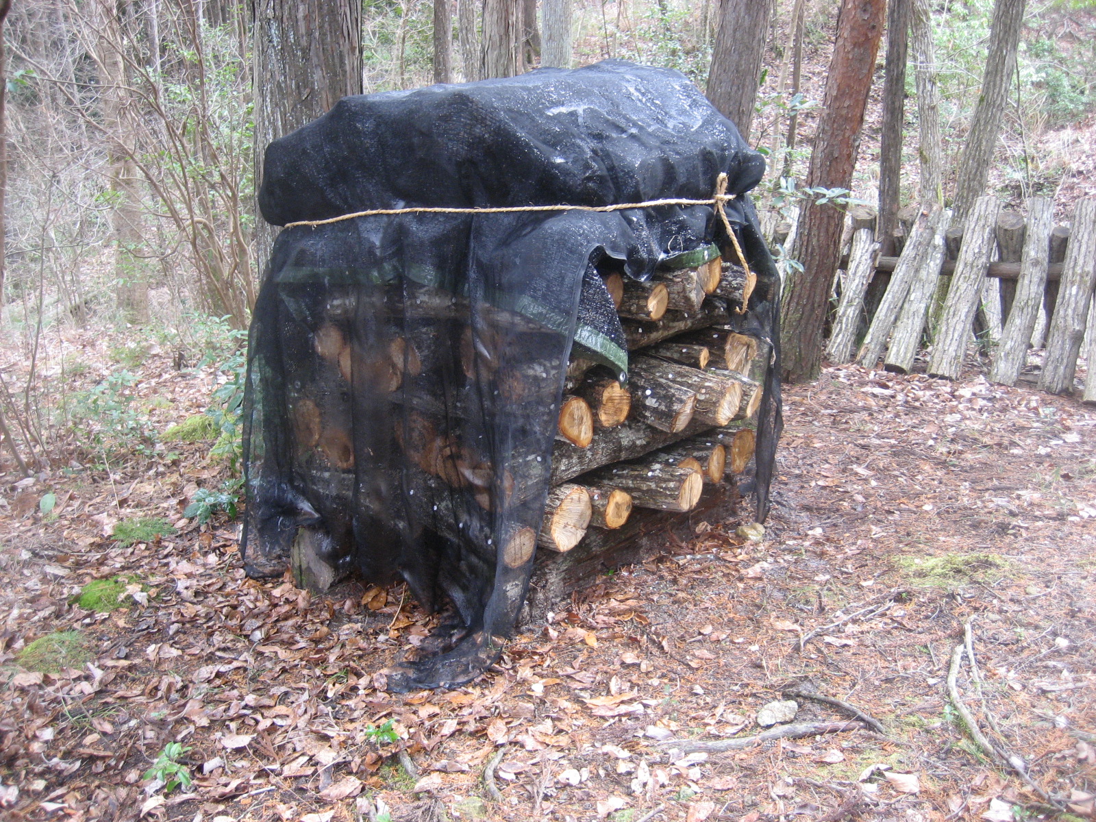 割った薪を薪小屋に保管し(約2年)乾燥させる作業