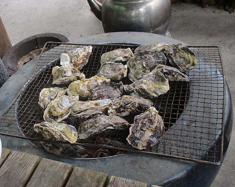 清水さん差し入れの室津産牡蛎を炭火で焼き