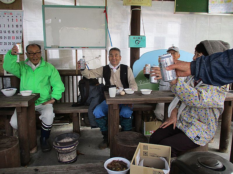 2023.12.22(金)前回に引き続き椎茸用ホダギ・炭焼き用雑木の伐倒搬出終了後納会1本締め