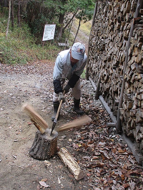 午前中に炭窯前に搬入した薪材の薪割り機による薪割り作業