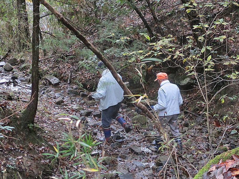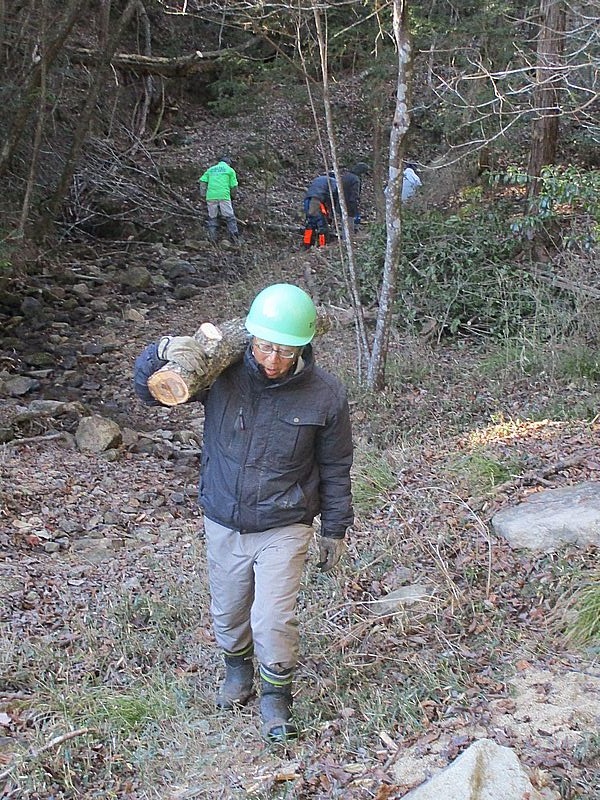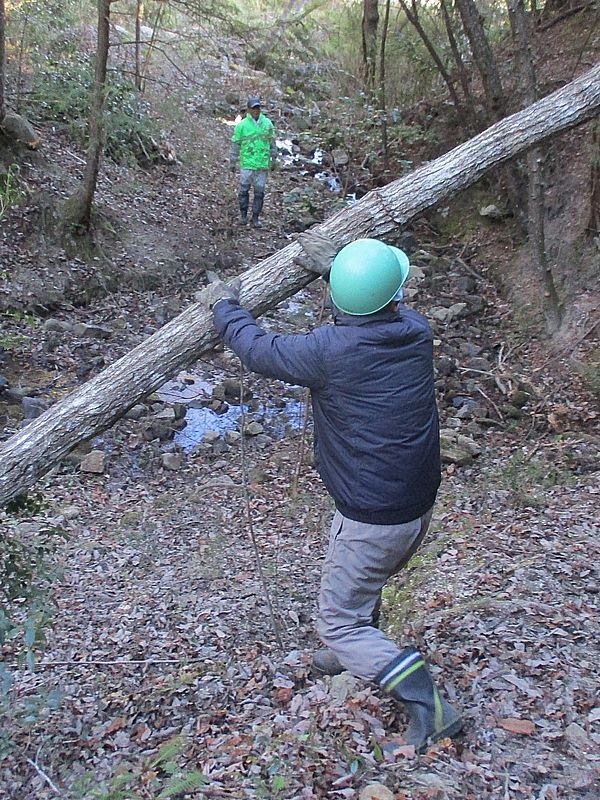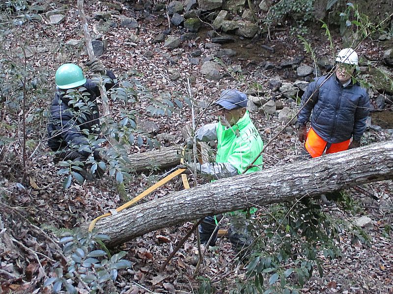 2026.01.17(土)前回、木橋の付け根が土砂でえぐられ大きな石を敷き詰めた後にセメントを流し込み固定作業及び炭材用にコナラの伐倒搬送作業