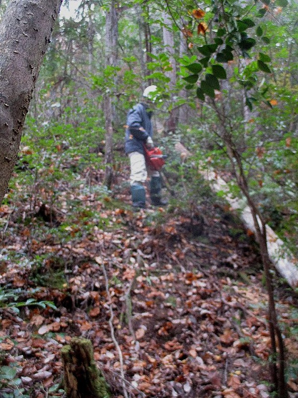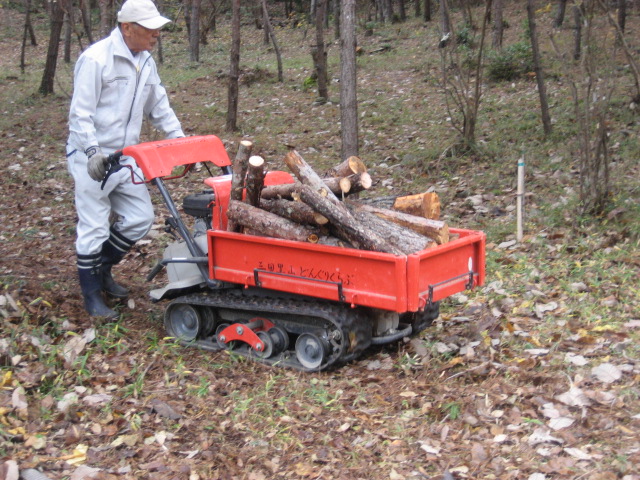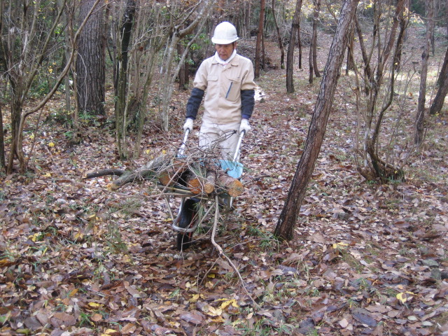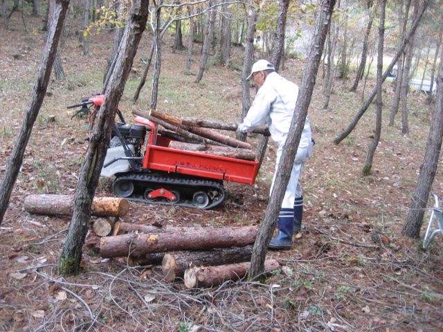 以前、伐倒し玉切りにしていた枯れ松を運搬車で散策路への搬送作業