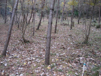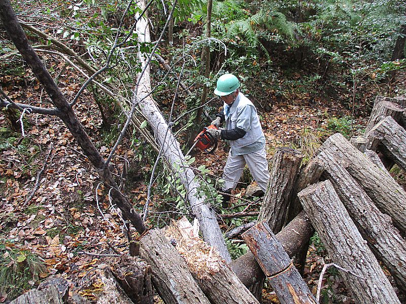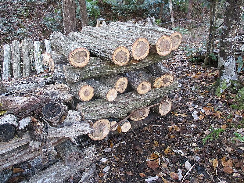 伐倒し椎茸ホダギ用に定寸切りし積み上げたホダギ