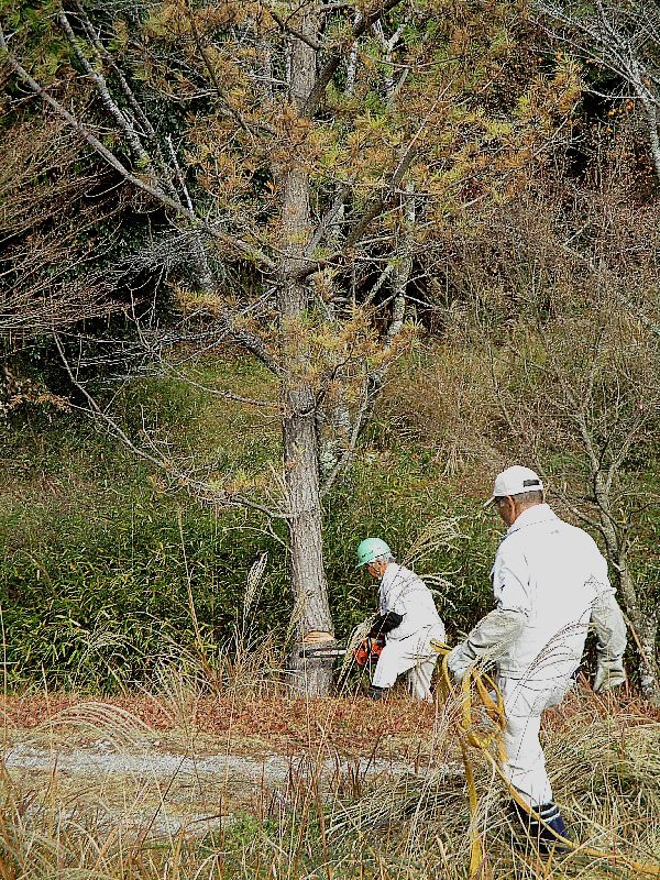 元気松林近くの散策路に倒れる恐れのある枯れ松の伐倒玉切り作業