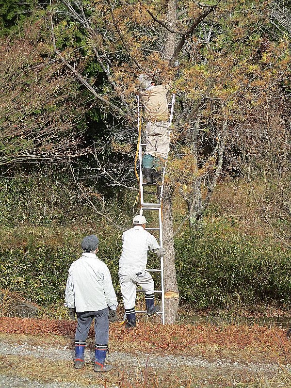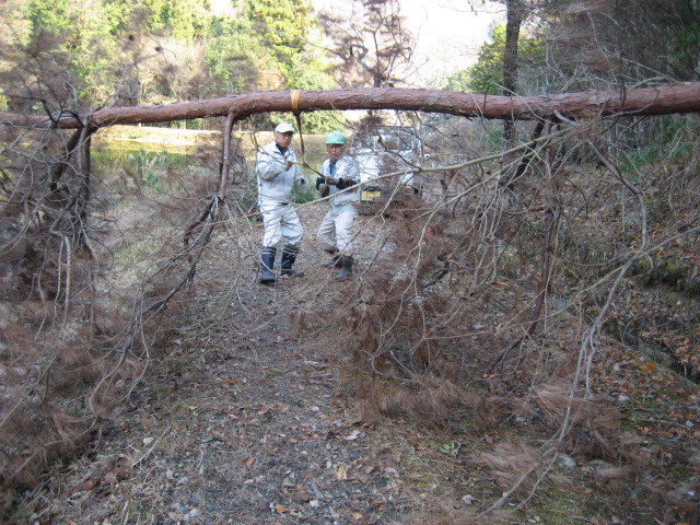 導入路の枯れ松伐倒作業 目標方向に倒すためロープを掛け