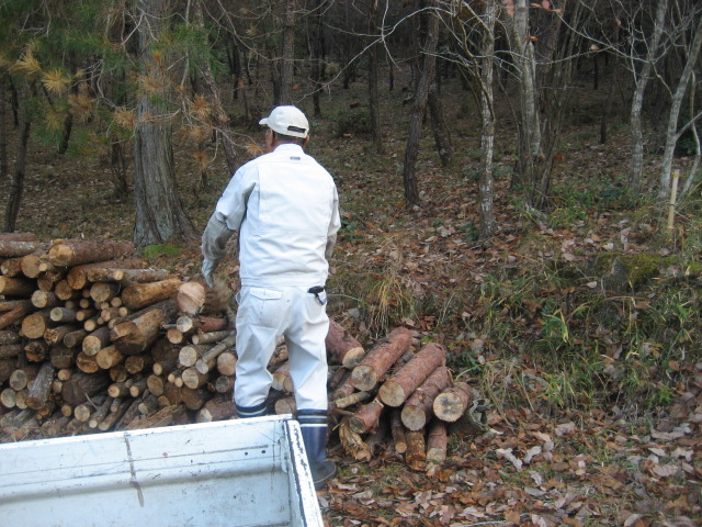 2026.01.23(金)(薪及び炭材)用にコナラの薪割り(薪割り機・手斧):共生センターに薪の搬送
