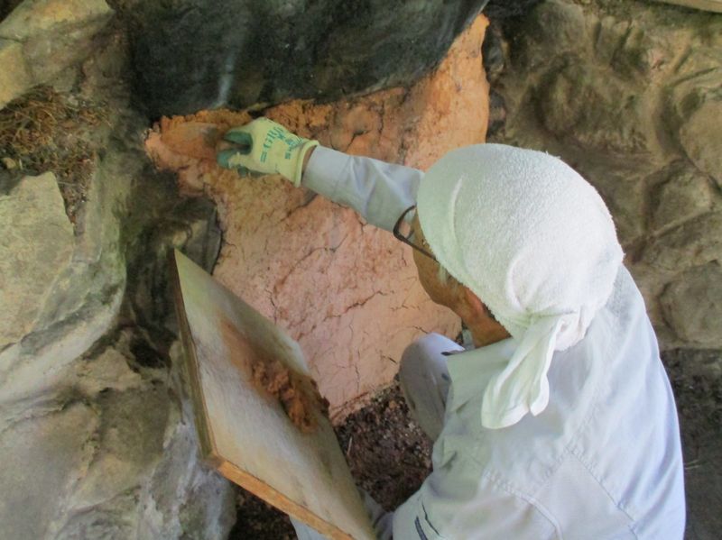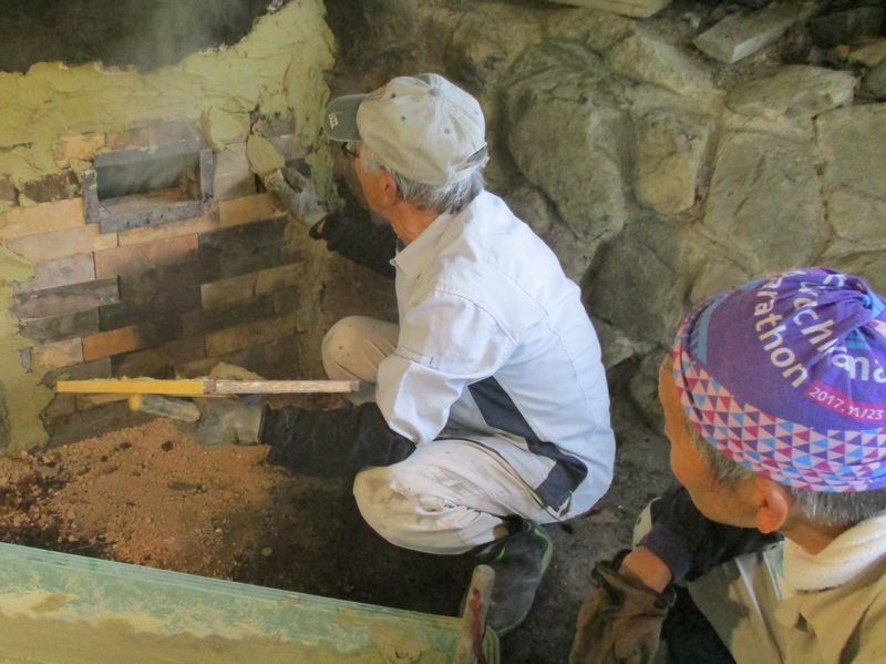 炭窯焚口の空気漏れを粘土で補修作業