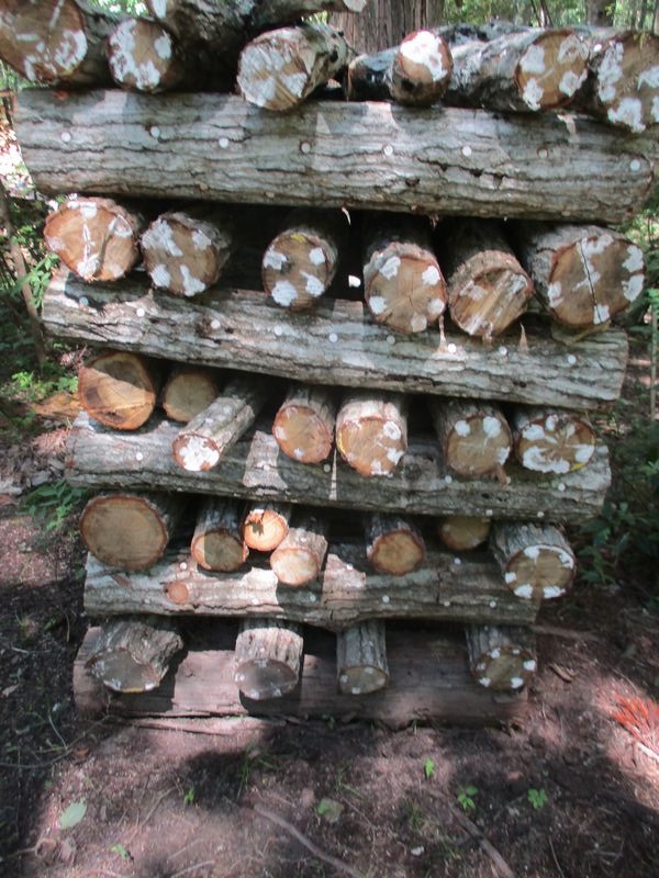 仮伏せの椎茸ホダギに椎茸菌が上手に回っています