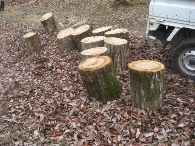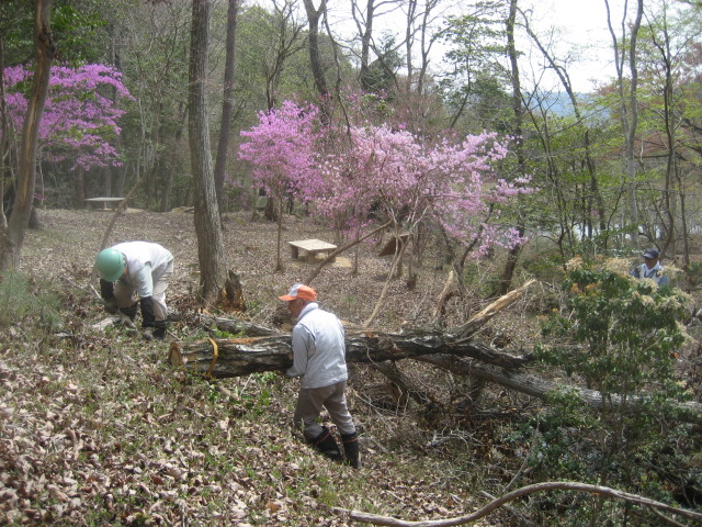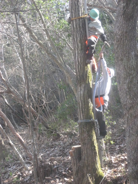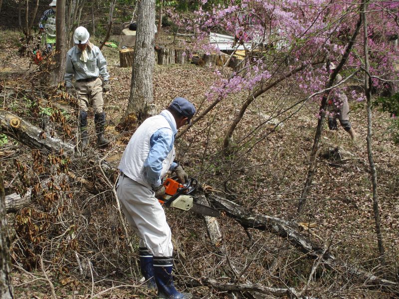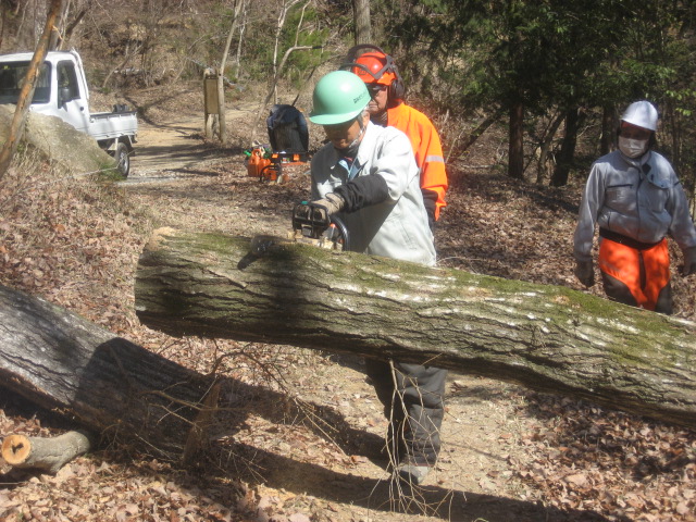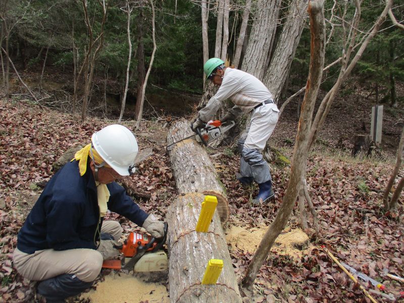 安全講習会で伐倒した「枯れコナラ」を薪材とするため「玉切り」作業
