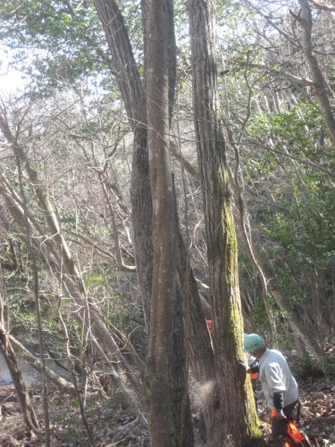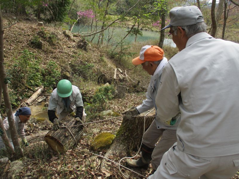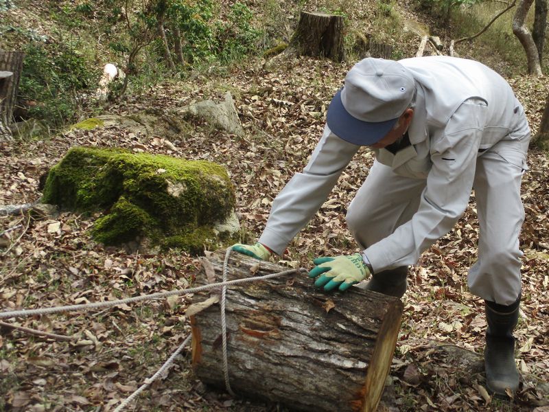 谷川に倒れたコナラをチルホールを使用して安全に玉切りできるところまで引き上げ