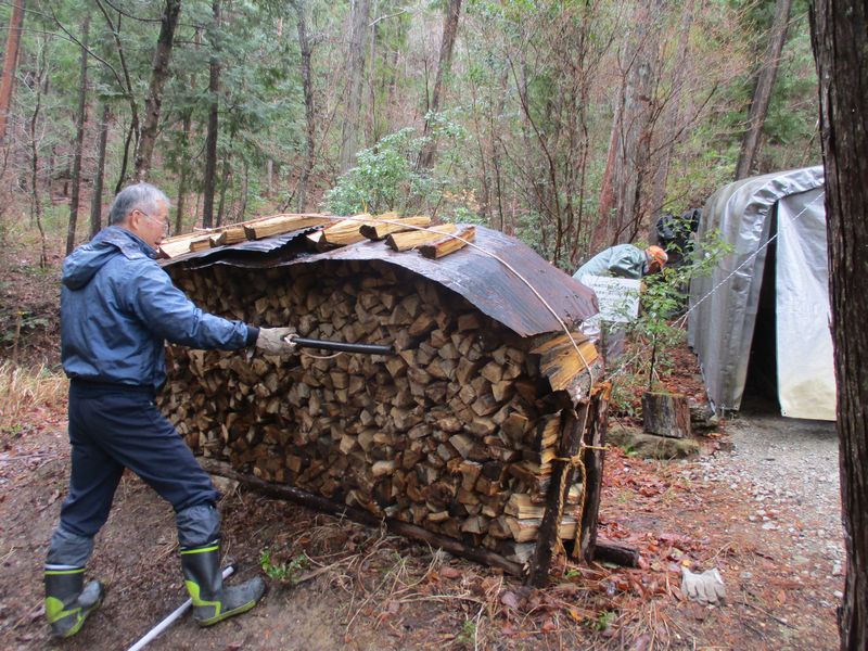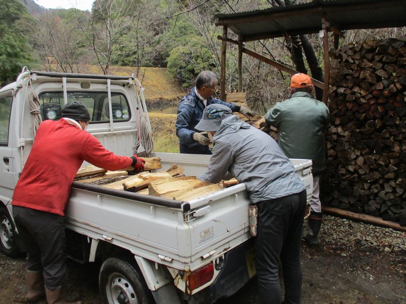 2026.01.23(金)(薪及び炭材)用にコナラの薪割り(薪割り機・手斧):共生センターに薪の搬送