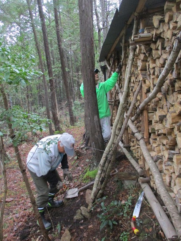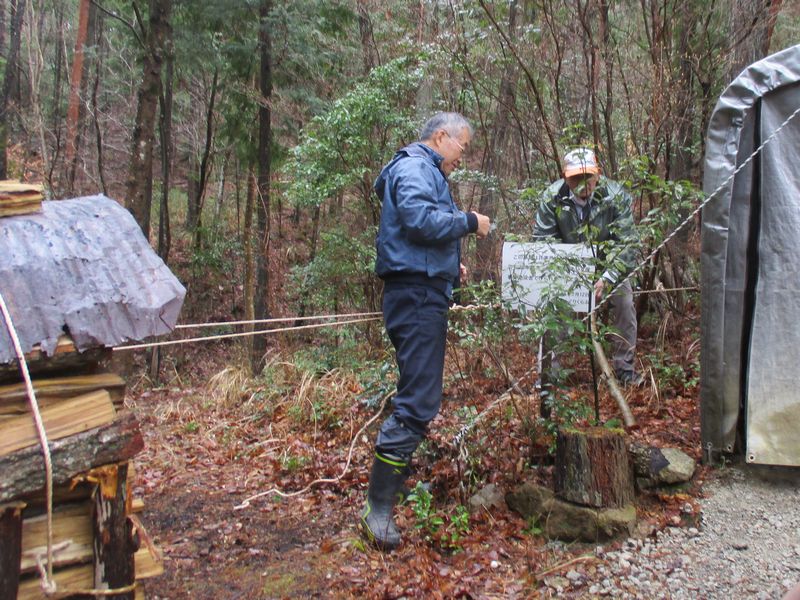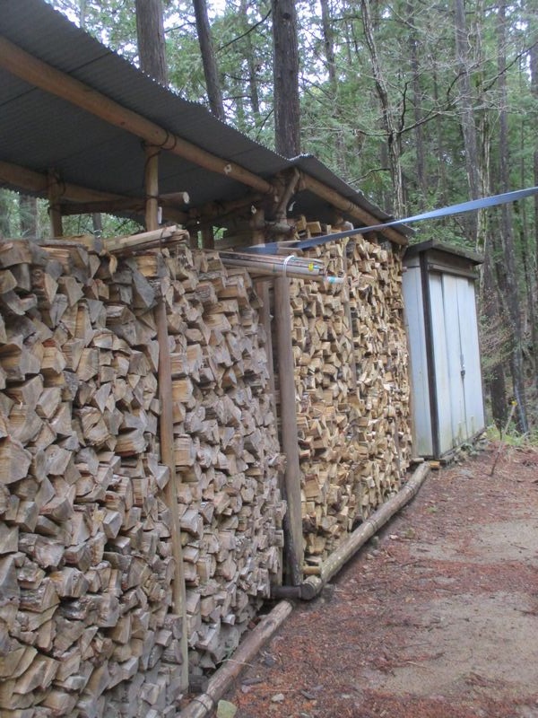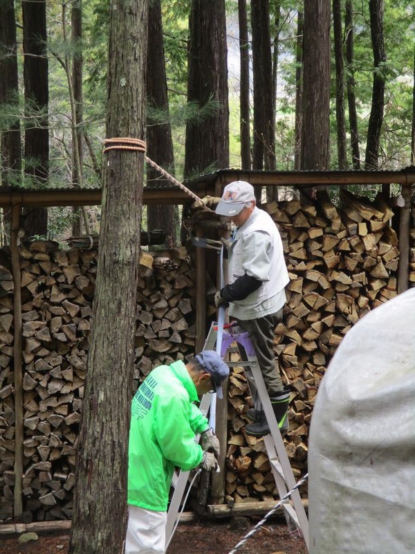 2023.03.18(土)生憎の雨ではあったが薪棚の調整(転倒防止)ロープ掛け