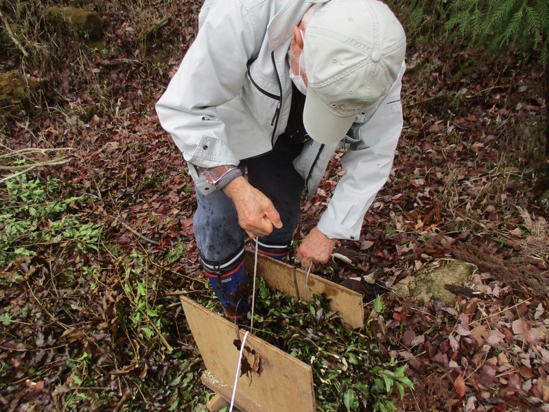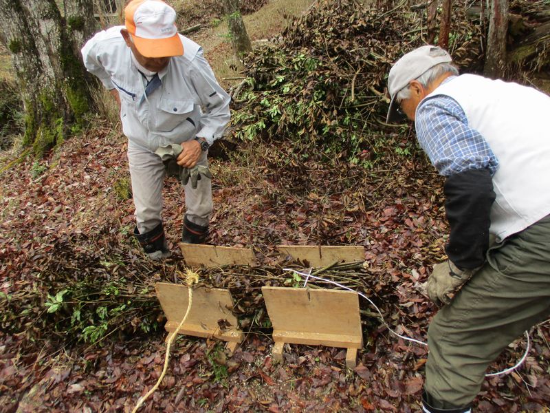 2026.01.17(土)前回、木橋の付け根が土砂でえぐられ大きな石を敷き詰めた後にセメントを流し込み固定作業及び炭材用にコナラの伐倒搬送作業
