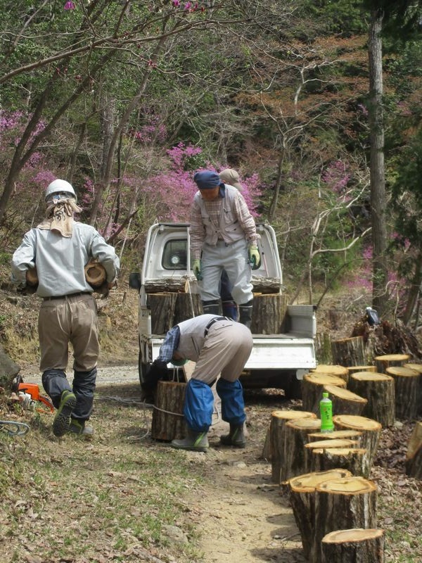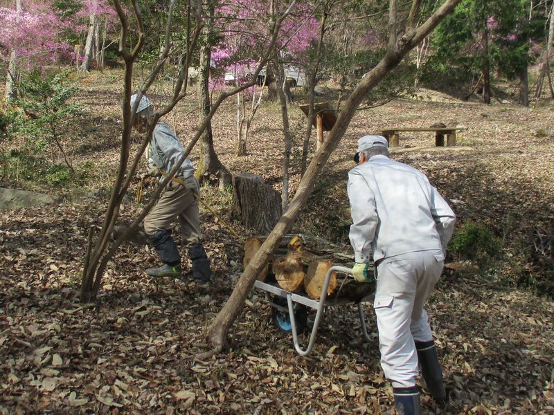 2023.04.02(日)前回に引き続き、安全講習会で伐倒した枯れコナラの玉切り及び炭窯前への搬送作業。お昼の牛丼美味しかったです。グルメ担当さんに感謝!!感謝!!