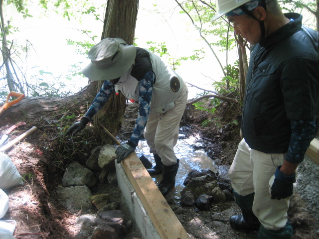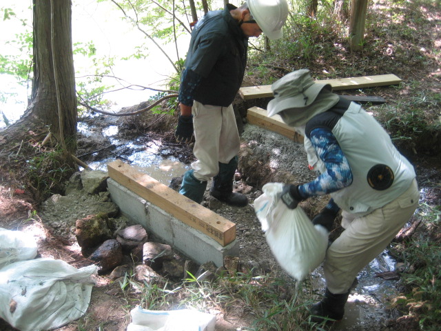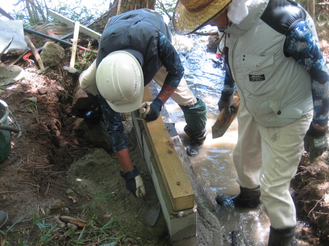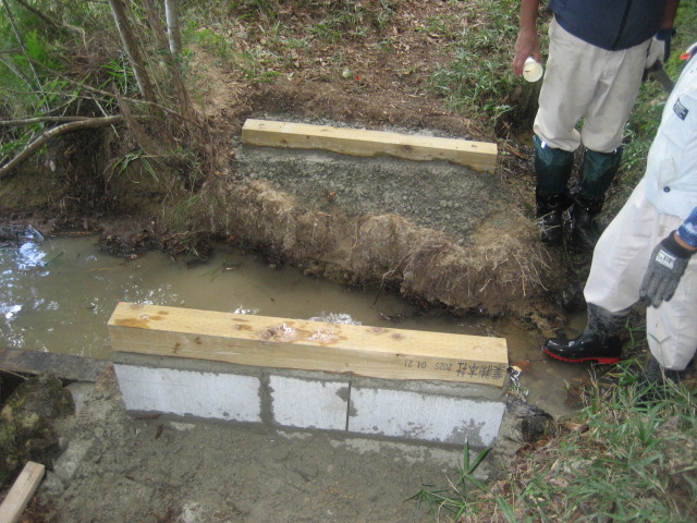 コンクリートブロックとセメントで木橋取り付け用土台の準備作業