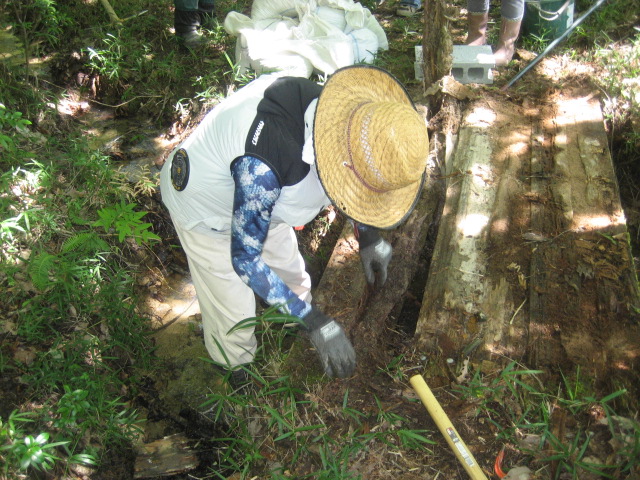 2025.07.19(土)1級建築士の資格を持つどんぐりくらぶスタッフの指導の下今回もナナマツ新池の腐食の激しい木橋の架け替え作業