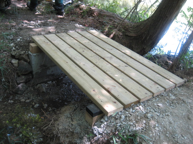 木橋土台に定寸切りした防腐木材(2☓6)と取り付け作業