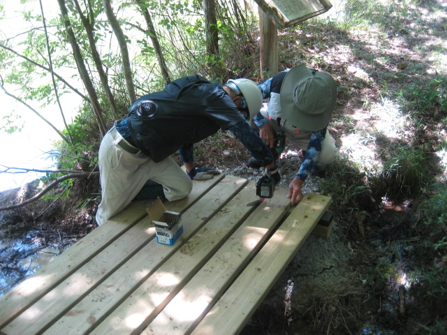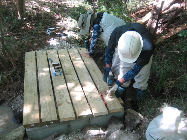 前回架け替え工事をした水辺の広場の床板への防腐剤塗り付け作業完了後