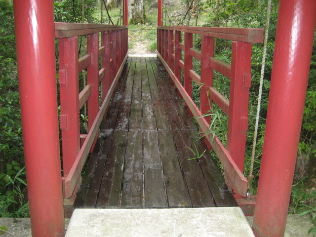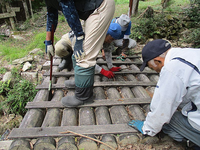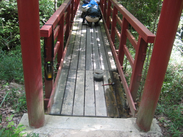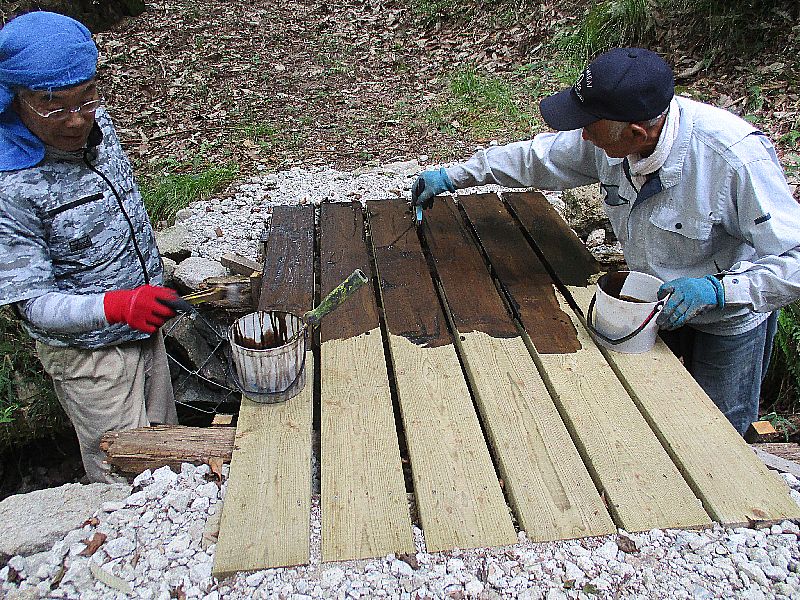 林間広場前の木橋(吊り橋)の床板も防腐剤塗布